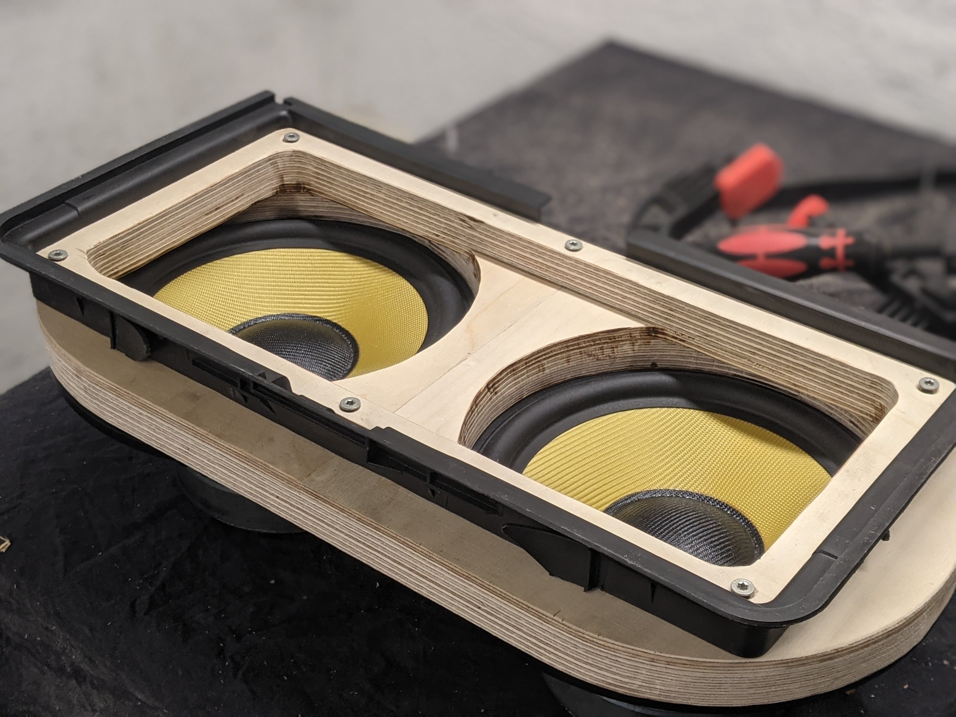 Mein Vater hatte noch 2 Visaton GF 200 auf dem Dachboden liegen und damit habe ich die ursprüngliche Verbandkastenbox in der Hutablage zum Tieftonabteil umgebaut.