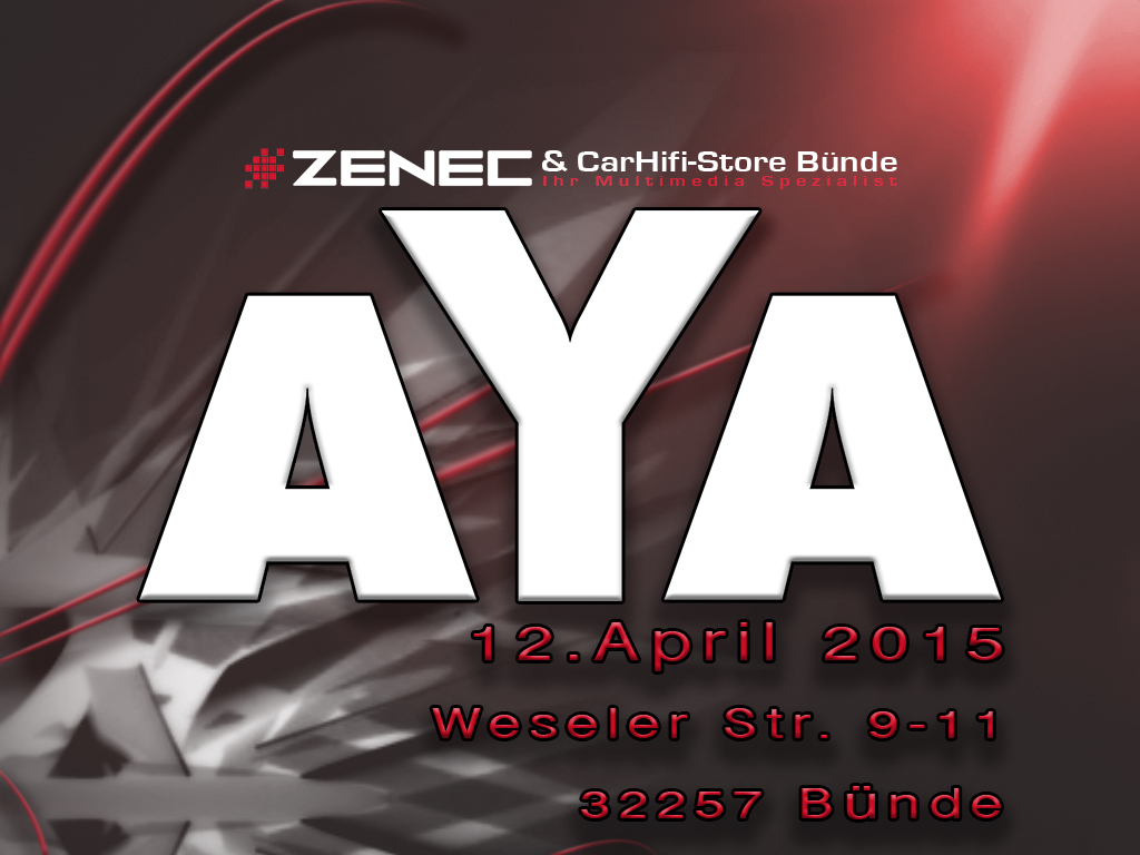 Endlich geht es wieder los! Am Sonntag, 12.4. 2015 startet die AYA in die neue Saison, und wie könnte man die besser beginnen als mit dem 10-jährigen Jubiläum eines unserer langjährigen Händlermitglieder, dem Zenec & Carhifi-Store Bünde? Nach ein paar Jahren Auszeit macht Inhaber Frank Nitsche wieder großes Programm. Neben dem AYA Wettbewerbs gibt es einen db-Contest für die laute Fraktion, eine großen Tombola und eine Hüpfburg für die Kleinen. Kulinarisch sind frische Burger angekündigt - wenn das nicht gut klingt!